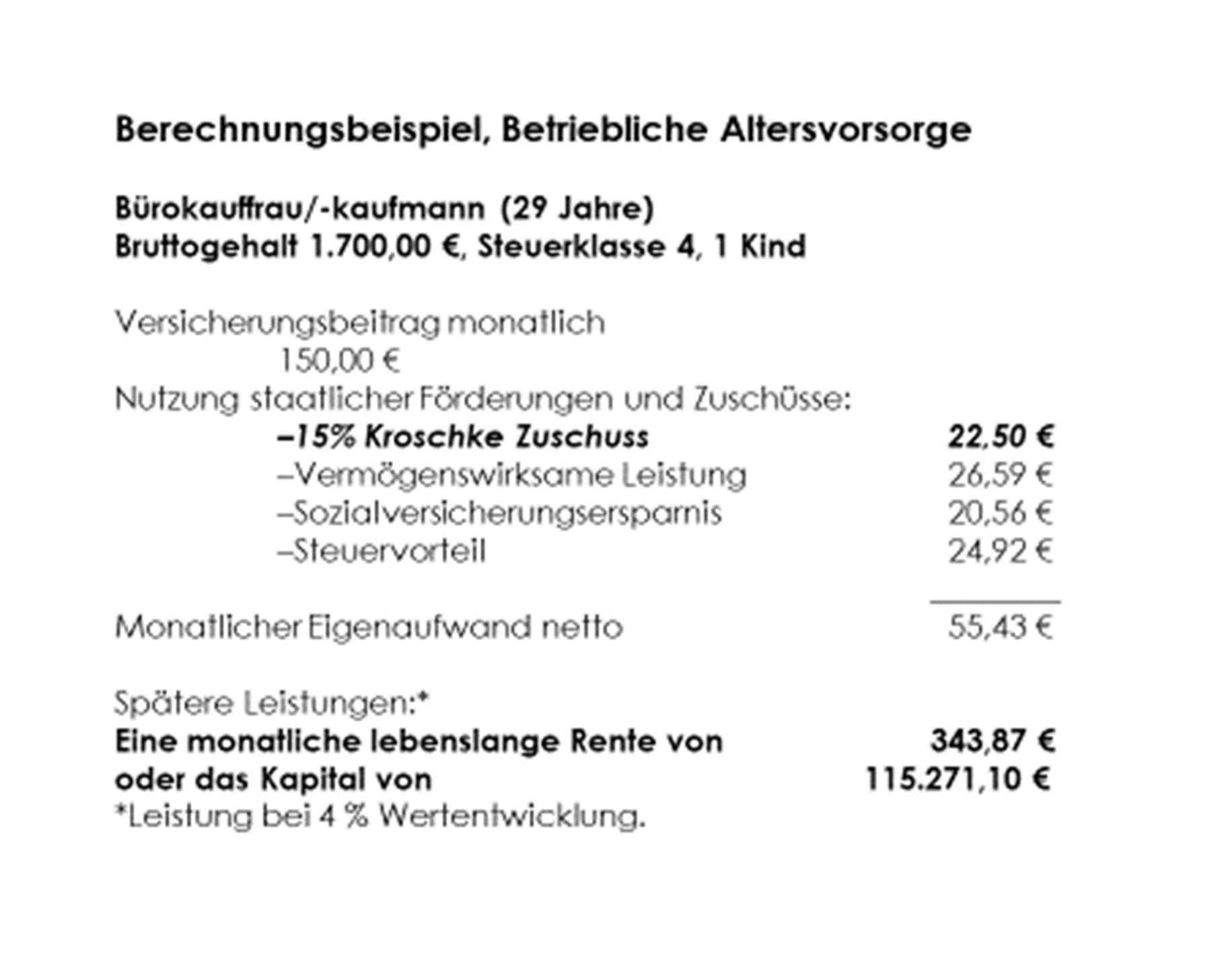Diese Zuschüsse umfassen 26,59 € pro Monat direkt vom Arbeitgeber, sowie 15% Kroschke-Zuschuss auf jeden Euro Gehaltsumwandlung.